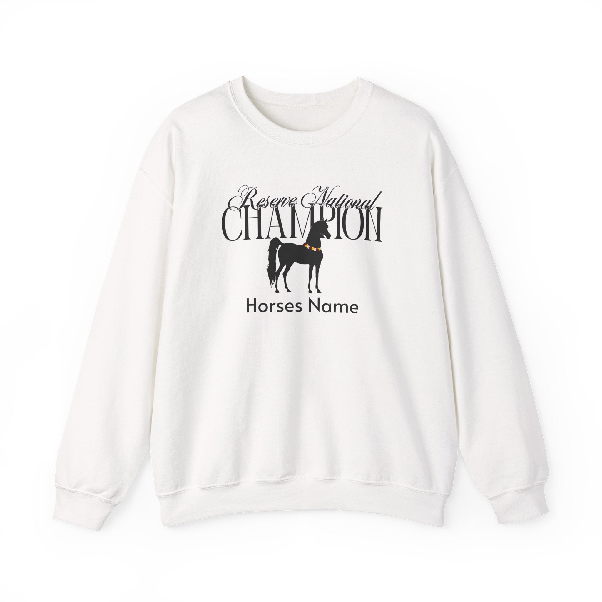 Show off your accomplishment with this personalized Arabian National Champion or Reserve National Champion Gildan sweatshirt. Crafted from a soft, cozy cotton blend, it’s perfect for staying warm at the barn, traveling to shows, or relaxing on cool evenings. The bold design proudly displays your title, with the option to add your horse’s name for a truly personal touch.